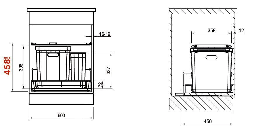Die Eimer der Reihe 350, Trolley Vario und Easysort werden in Schubkästen mit Vollauszug eingebaut, die mit einer Seitenreling oder einer hohen Seitenwand ausgestattet sind. Für diese Mülleimer empfehlen wir die Vollauszüge der Firmen Blum, Grass oder Hettich.
