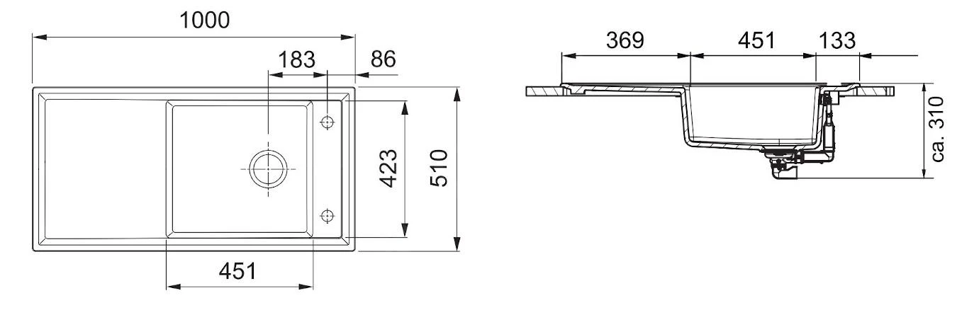 - Abmessungen des Spülbeckens 451 x 423 mm