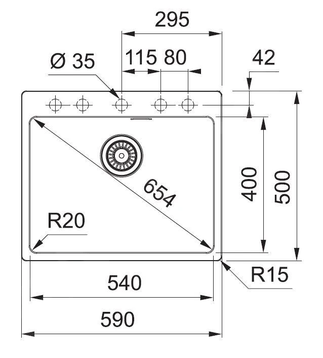 - Ausschnitt 570 × 480 mm (Radius 15 mm)