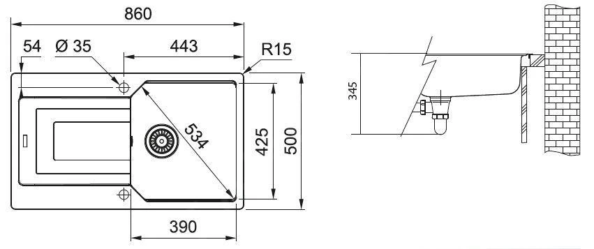 - Abmessungen des Spülbeckens 390 x 425 x 220 mm